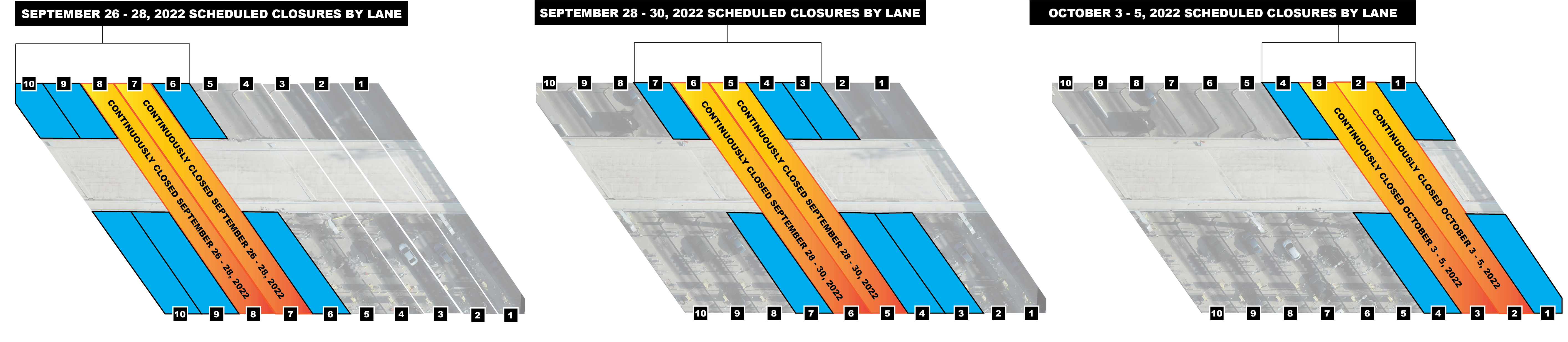 - September 26, 2022 to September 28, 2022 - The five westernmost northbound vehicle lanes (6-10) will be closed during non-peak, nighttime hours, from 8 p.m. to 6 a.m. Lanes 7 and 8 will remain closed continuously, including during daytime hours.