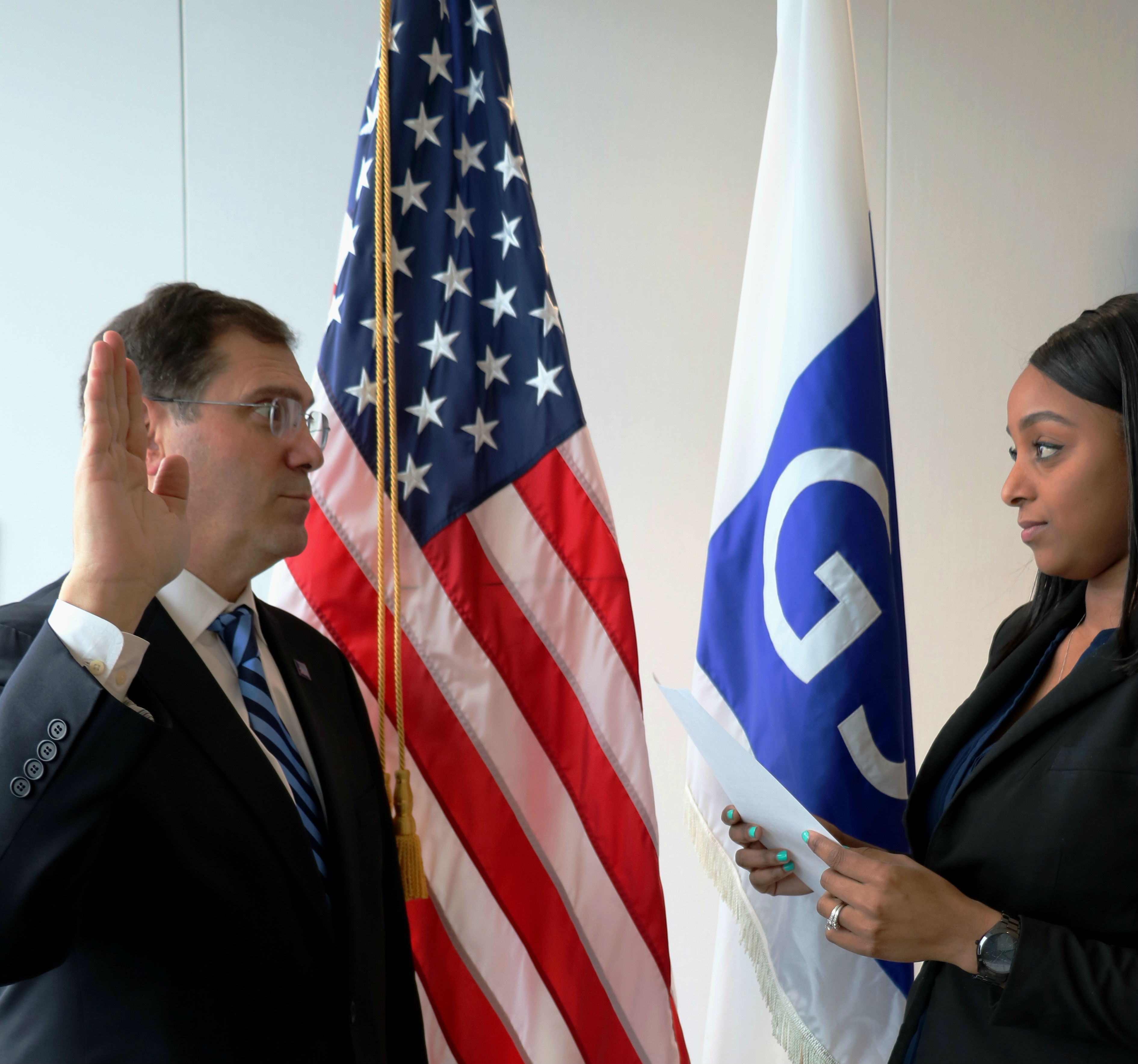 John A. Sarcone III takes the oath of office as Regional Administrator of GSA’s Northeast and Caribbean Region from Loretta Franco, human resources specialist Feb. 12, 2018. Photograph by Alison Kohler