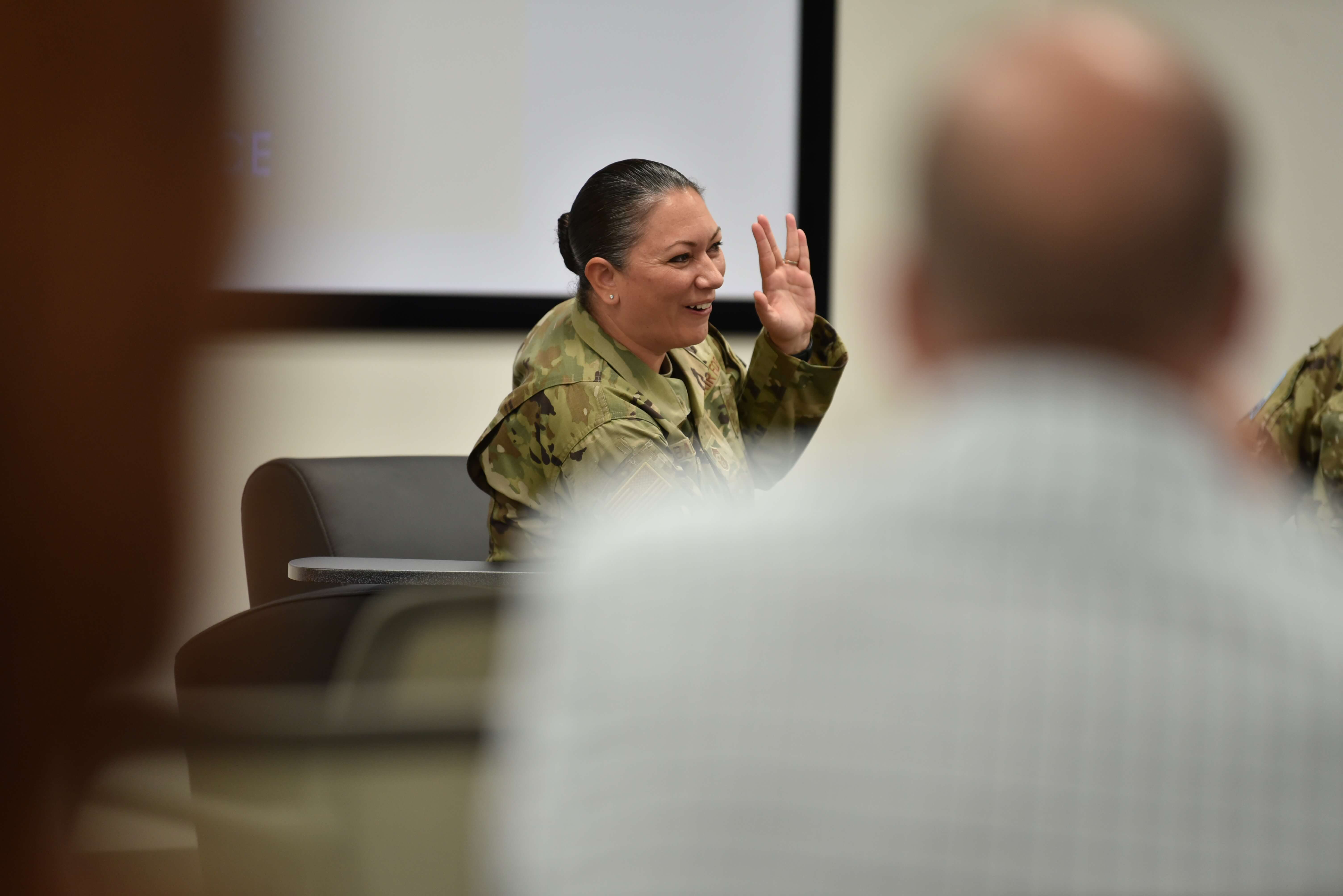 CMSgt Sevin Balkuvvar gives a “vulcan salute” during the Region 8 Veteran Program. Photograph by Aaron Sager