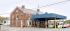 Two level brick building with two chimneys and a blue driveway cover with two booths and yellow ground posts Calais Ferry Point LPOE