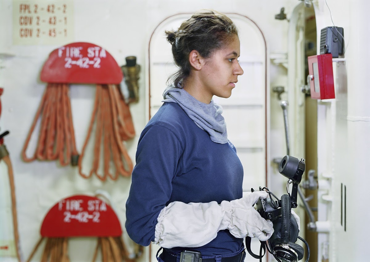 Also located in the Douglas A. Munro Coast Guard Headquarters Building is An-My Lê’s fifty-one photograph series titled True Bearing, completed in 2013. Inspired by the individuals who serve in the U.S. Coast Guard, Lê documented the complex roles and mission of this branch of the U.S. Armed Forces. To create these photographs, Lê traveled with the U.S. Coast Guard across the country, from the sunny shores of Hawaii to the frozen island of Kodiak, Alaska. Her documentary approach resulted in a diverse range of images, from introspective portraits of young cadets on duty to a towering display of an icebreaker vessel in dry dock.