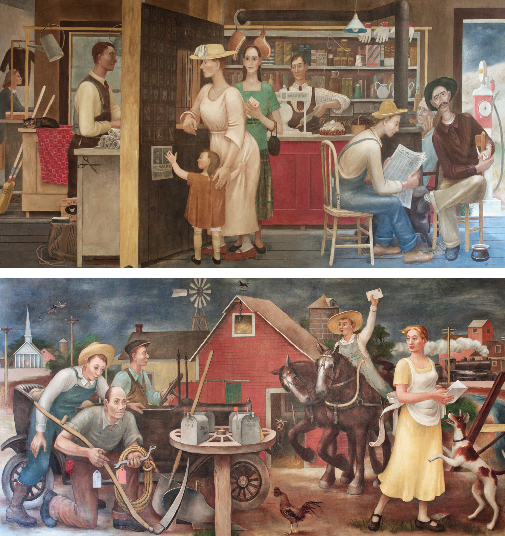 Doris Lee, an accomplished and well-known painter during the first half of the twentieth century, is now the subject of a major retrospective exhibition organized by the Saint Louis Art Museum and the Westmoreland Museum of American Art. In 1935, Lee was the only woman to be awarded a prestigious U.S. Post Office Department commission from the Section of Fine Arts. Both paintings, “Country Post” and “General Store and Post Office,” are now at the William Jefferson Clinton Federal Building in Washington, DC. They portray the vital role of the U.S. Post Office in rural communities. Each of the large paintings shows a sympathetic and detailed picture of country life in America, and both are prime examples of Lee’s popular figurative style.