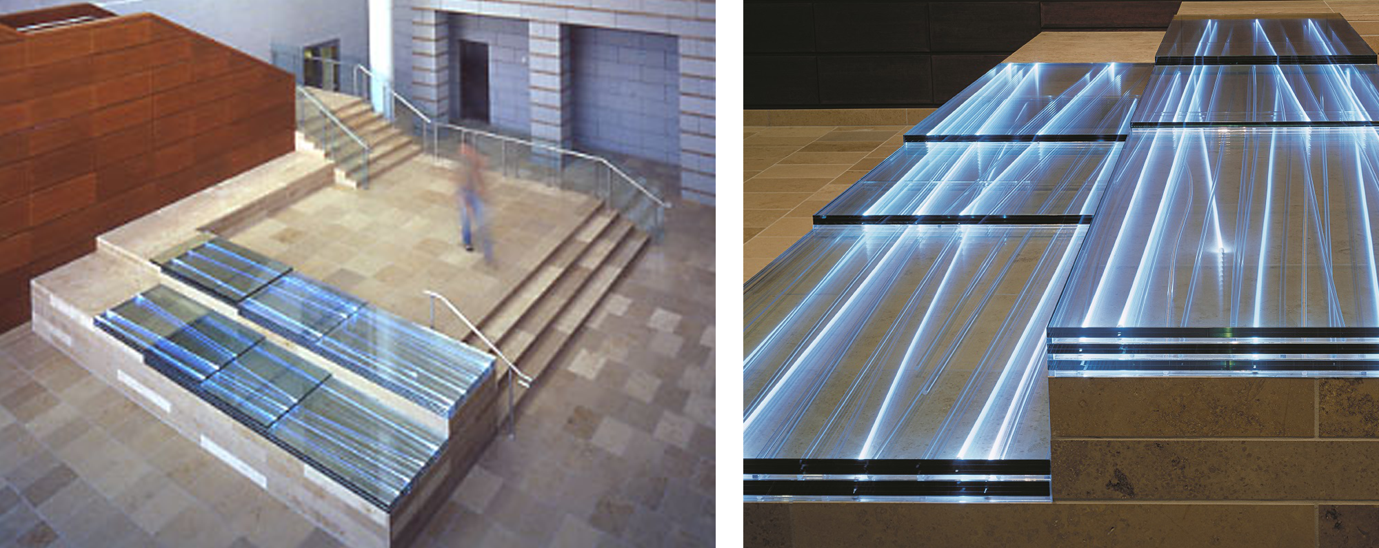 Mikyoung Kim is an environmental artist and landscape architect whose work ranges from single sculptures to large-scale master plans. Her “River of Light” was made for the Federal Building & U.S. Courthouse Annex in Wheeling, West Virginia. It is an unconventional representation of a river. The contrast of the translucent sculpture with the solidity of the stone surrounding it, combined with the fluidity of light, suggests the flowing water of the Ohio River through the hilly West Virginia landscape. The river has always been an essential element of Wheeling’s identity. During the nineteenth century, when a steady stream of enterprising pioneers made the trek westward along the Ohio River to the Mississippi River and beyond, Wheeling became a prosperous industrial and commercial center, known for its glass factories and iron foundries. The glass panels in “River of Light” refer to the city’s industrial past, when Wheeling was a center of glass production.