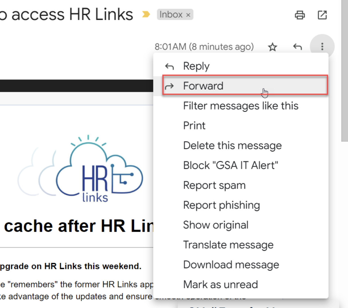 To forward the selected email with GMail, select the left flow arrow for Mail Actions and select Forward, or you can select the Forward link at the bottom of the email, or last email in the email thread.