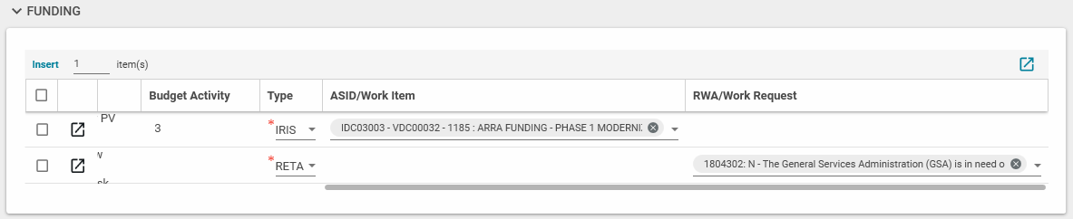 The Funding section is where ASID/Work Items and RWA/Work Requests should be entered. The IRIS Work Items and RETA Work Requests listed in this section are linked to several apps within Kahua. They also determine funding information that is integrated with IRIS or RETA, so it is important this information stays updated.