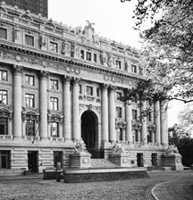 A grand stair, facing Bowling Green, provides a stately approach to the building. The cavernous entry is set within a barrel vault, enhanced with blue, gold, rose, and green mosaics and Levanto marble columns. Bronze gates secure the paneled bronze doors leading into the Great Hall.