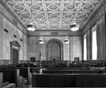 The corridors and primary courtrooms, which feature double-height windows, are located on the third floor and are largely intact, with many original furnishings such as decorative aluminum railings. The courtrooms share some of the same material palette used for the ground floor, along with paneled walnut and padded leather for the double entrance doors.