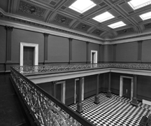 Lobbies at the east and west entries to the building have floors covered with fossiliferous black and white marble tiles laid in a diamond pattern. In the west lobby, a cast-iron stair with decorative railing leads to the second floor. On the second floor, a narrow circular staircase leads to the attic.