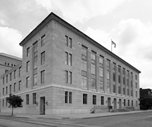 Completed in 1932, the U.S. Post Office and Courthouse represents an important example of 1930s Neoclassical federal architecture in the Modernist manner. A cornerstone near the entry indicates this building was completed under James A. Wetmore, who served as acting supervising architect of the U.S. Treasury from 1915 to 1933. The design itself was likely overseen by Louis A. Simon, an MIT-trained architect who served as superintendent of the architectural division under Wetmore and designed hundreds of significant federal buildings across the country. In addition to the post office and the federal courts, the original tenants in the newly opened building included the U.S. District Attorneys, U.S. Marshals Service, Prohibition Service, U.S. Army Reserve, Internal Revenue Service, and Labor Department.