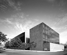 The building presents itself as a cube that has been deconstructed into four units: a dramatic cantilevered courtroom block on the front with office blocks on each side and to the rear. These four components surmount a single-story base called the podium. The building is clad in flame-treated Royal Pearl granite from Georgia and bronze-tinted, heat-absorbing, glare-reducing glass with slim bronze-anodized aluminum mullions. Architect Victor Lundy’s skillful use of materials and voids between blocks articulate the units.