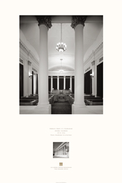 The main entry lobby spans the width of the building, with windows opening out through the portico. It has a terrazzo floor and vaulted ceiling with arches springing from the pilasters. Names of Pony Express riders adorn the marble-faced walls. The U.S. Court of Appeals is located on the second floor along with the Law Library and a District Courtroom. The Law Library (now Courtroom Four) is clad with carved oak panels. An eagle and the inscription, “Lux et Veritas” (light and truth), crown the exit. The U.S. District Courtroom A with its arched ceiling and pink-tinged white marble walls retains its original gold-trimmed black velvet drapery in the apse behind the judge’s bench.
