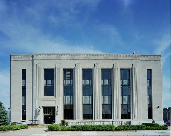 Windows throughout the building are narrow vertical forms with embossed bronze spandrels between each story. Each opening is topped by a dentil course. Stylized fluted pilasters (attached columns) divide the window bays and are a classical feature. The pilaster capitals, however, contain a simplified floral design characteristic of Art Deco architecture. The entrances on the Sixth Street elevation are flanked by fluted pilasters with carved limestone capitals featuring a stylized eagle motif, which alludes to the federal presence.