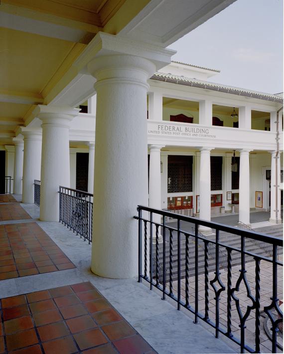 The reinforced concrete building is covered with painted stucco. The original building is rectangular, and the wing additions extend forward from the facade to form a U-shaped footprint. The facade is organized around a central courtyard. The building is three stories in height with a penthouse. Open-air loggias, which are divided into three distinct levels, face the courtyard and provide building occupants with pleasant views and circulating air currents. The loggias also function as exterior corridors and provide primary circulation for building occupants. One of the building’s most appealing features is a two-story colonnade supported by monumental Tuscan columns. The colonnade is located on elevations facing the courtyard and supports the loggia on the first and second stories, while simple, square piers support the third-level loggia. Wrought-iron balusters are located on the first and second floors on portions of the colonnade. Decorative elements within the courtyard, including colorful mosaic tiles and urns, emphasize the Mediterranean Renaissance Revival style of the building, which blends classical and exotic motifs. Wrought-iron light fixtures are located on the building, and a wrought-iron grille with a gilded eagle tops the entrance to the postal lobby.