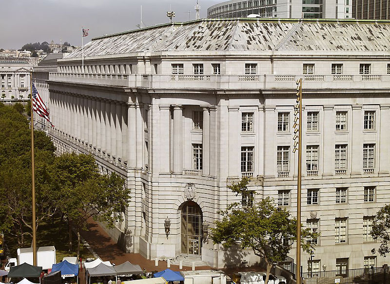50 United Nations Plaza Federal Building, San Francisco, CA. The seven story steel frame and masonry Beaux-Arts Neo-Classical style building underwent a full modernization and renovation funded AARA monies. Arthur Brown, Jr., Architect.